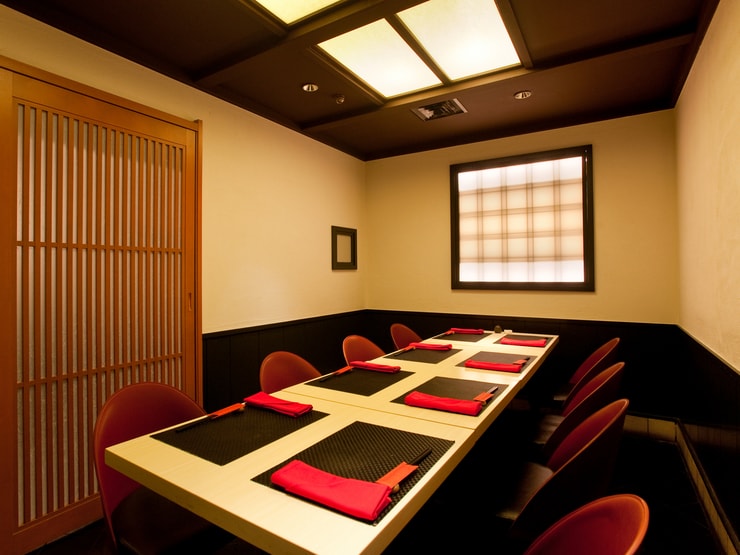 新宿駅から徒歩5分の場所にある【麓屋 京王プラザホテル】は、四季折々の食材を使った日本料理と自家製蕎麦が楽しめる和食店です。店内は和の趣を大切にした上質な空間で、カウンター席やテーブル席に加え、個室や半個室を完備しています。個室は4名から利用可能で、最大27名まで対応できるため、大人数の宴会にも適しています。