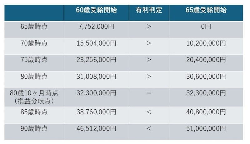 60歳受給開始、65歳受給開始のそれぞれの累積受給額を表にしました。