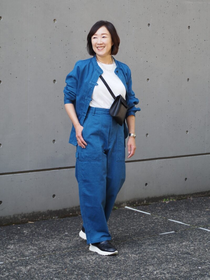 デニムのジャケットとパンツを主役にしたカジュアルなスタイリングは、秋の行楽シーズンにベストマッチ。「生地が薄手なので、アウターとしてもシャツとしても使えます」。美シルエットのパンツは、トップスをインすることで脚長効果も◎。