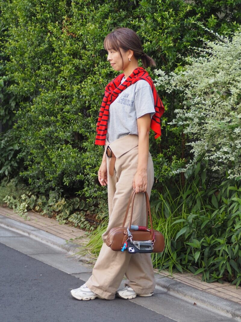 一見ベーシックなTシャツ×チノパンの組み合わせを、挿し色や小物使いで今っぽく仕上げたカジュアルスタイル。「トップスもパンツもすごく気に入っていて、2色買いしました」。赤×黒ボーダーのカーディガンを肩にかけ、目線を上に持ってくるスタイリング術もお見事!
