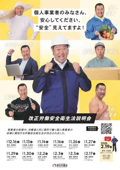 厚労省は改正の趣旨について説明会を昨年12月から今年2月にかけて実施中。説明会のポスターにはお笑い芸人の「とにかく明るい安村」さんが登場しており、「個人事業者のみなさん、安心してください。“安全”見えてますよ!」と謳っている。