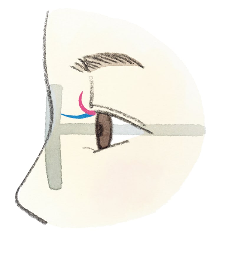 まつ毛が下がっていると、どうしても毛先がレンズに触れてしまいます(イラスト青)。