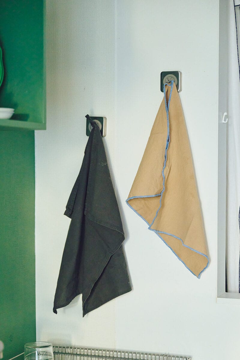 窓辺には、素材違いの布とリボンをランダムに下げてカーテン代わりに。