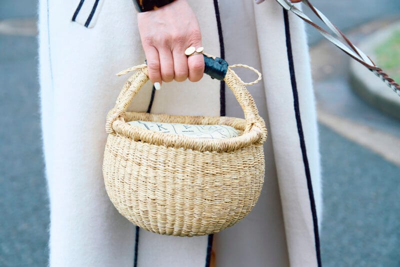 Beau(ボー)ちゃんとお散歩に行くときは、尿を流すウォーターボトルやエチケット袋、おやつなど、荷物がいっぱい。持ち運びがラクで可愛いかごがコーデにマッチして重宝します。
