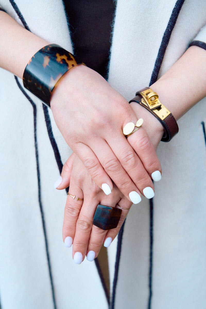 カジュアルなスタイルのときこそ、アクセサリーでドレスアップするのが、栗谷さんのルール。「マニッシュにひとさじエレガントなアイテムを合わせる、そんなミックスコーデが私らしいと思います」と栗谷さん。エルメスのレザーバングルやべっこうのバングルで、手首に品格をまといます。