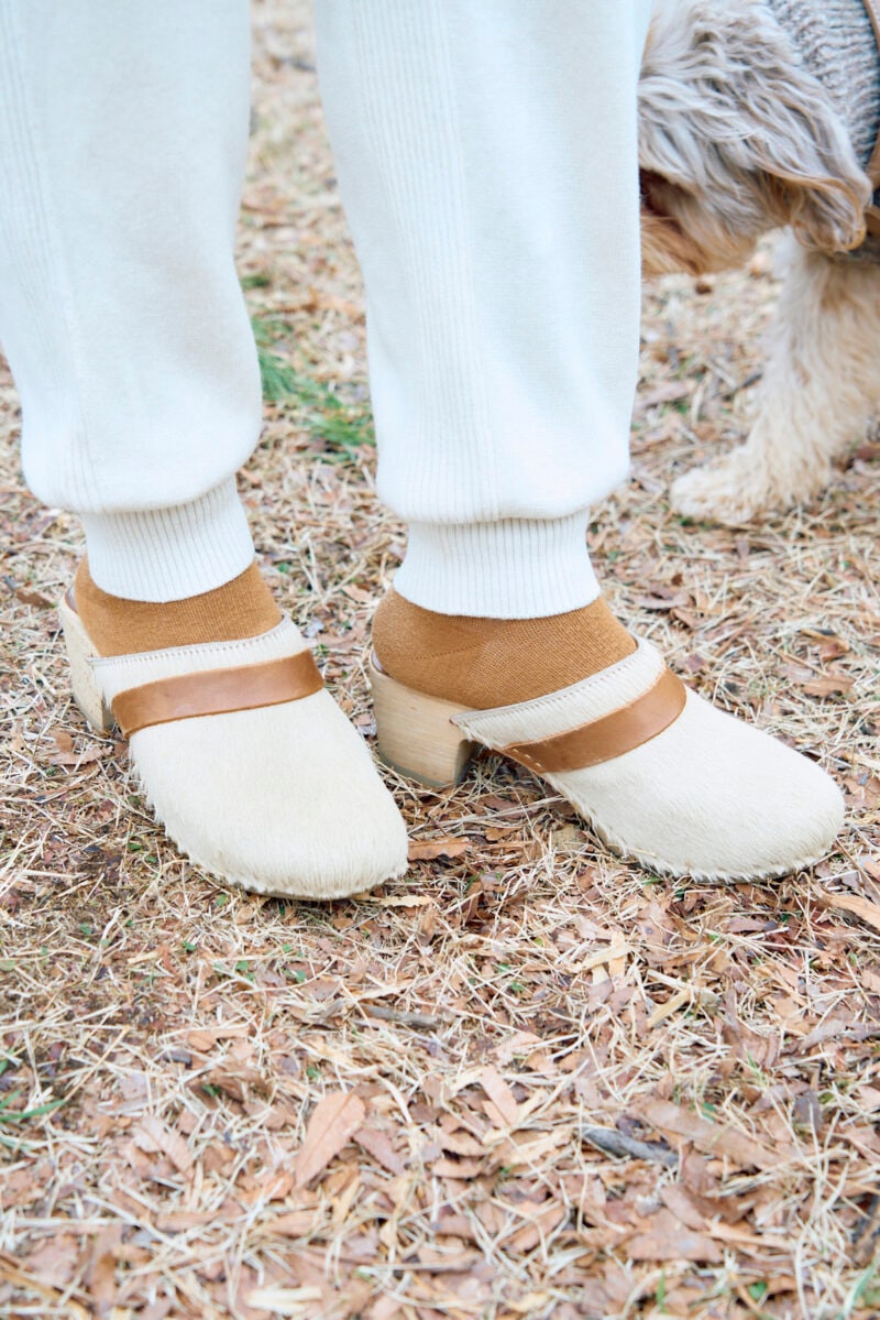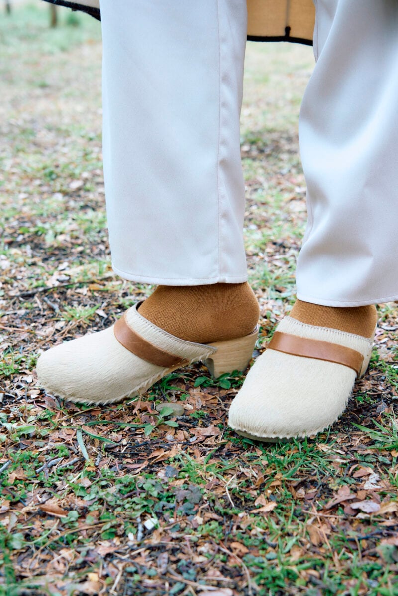 栗谷さんの足元は、オフホワイトとライトブラウン。「肌ざわりがよく、落ち感のあるシルクのパンツには、5cmヒールのサボを合わせました」と栗谷さん。ヘアカーフとレザーベルトのデザインが、パンツとのバランス◎。