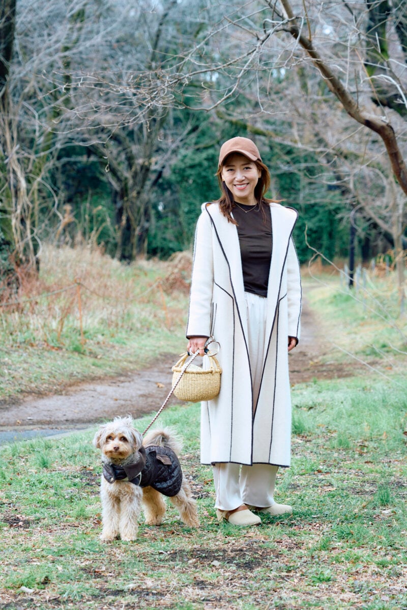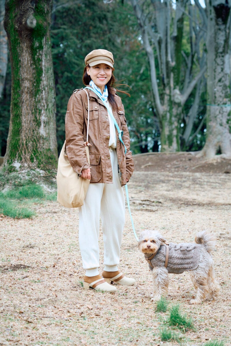 昨年から東京と軽井沢の二拠点生活を始めた栗谷さん。「Beau(ボー)を家族に迎えて、毎日の散歩が大切な時間になりました。夏になるとヒートアイランド現象の影響で東京では散歩が難しく、軽井沢に半移住することに。春は平日を東京で、週末軽井沢へというスケジュール」と栗谷さん。東京から軽井沢へのドライブは、一日中着ていても疲れない洋服を選びます。「カットソーとシルクパンツでストレスフリーに。カシミアコートも軽くて肩が凝りません」(栗谷さん)。白をメインにブラウンを効かせたフェミニンなコーデに、キャップやサボなどの小物でカジュアルにまとめました。