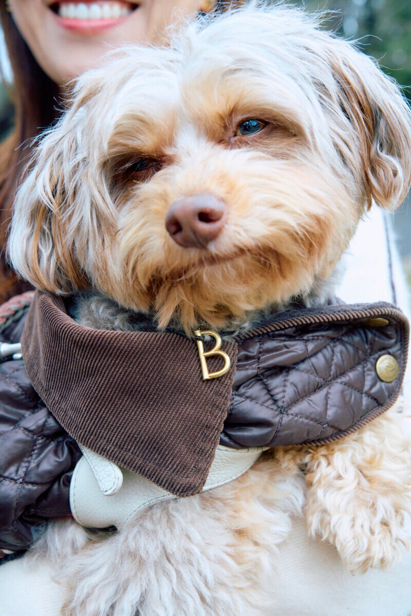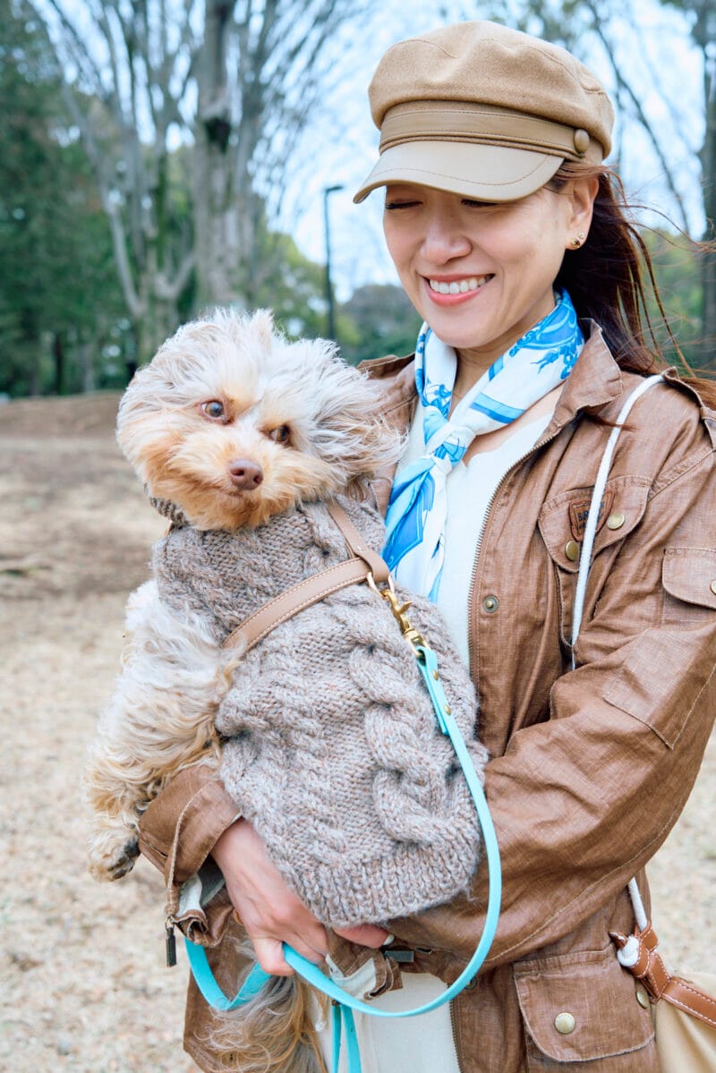 栗谷さんの洋服に合わせて、愛犬のBeau(ボー)ちゃんもブラウンカラーで。「イニシャルの『B』のチャームは人間用で、仲良くしていただいている『ビョーカ』さんで購入しました」