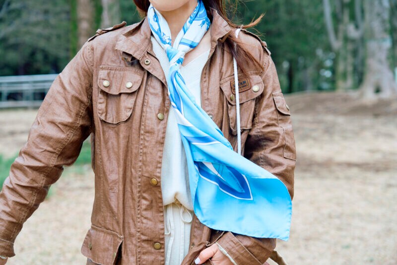 スカイブルーのエルメススカーフを差し色に アウトドアカジュアルにマリンを効かせて