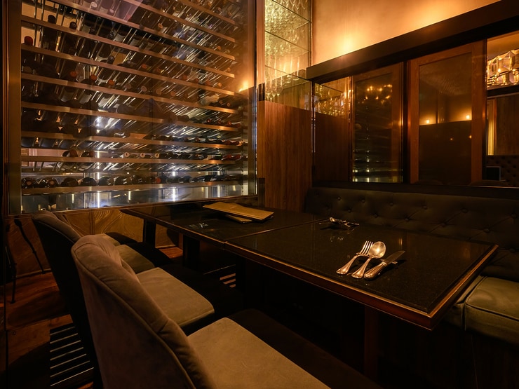 シャンデリアが輝く店内は、オーナーがセレクトしたインテリアが配されたセレブリティな空間。シックな黒のテーブルとソファが上質な雰囲気を醸し出し、木の床やダウンライトが落ち着きやぬくもりを感じさせます。カウンター席のほか、モダンでスタイリッシュな個室も多数用意されていて、特別な日に最適な一軒です。