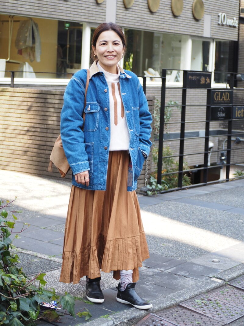 春の定番アイテムといえば、デニムジャケット。KOBAさんは少し甘めのロングスカートを合わせて甘辛ミックスに仕上げています。シャリッと光沢のあるスカートが、歩くたびに揺れて動きのあるシルエットに。バッグ、さらにはニットの柄もキャメルで統一。