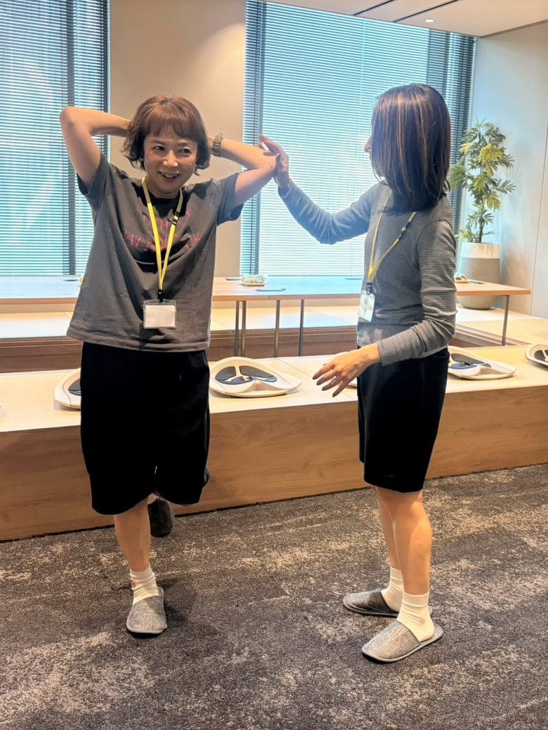 15分間の体験終了後、再びペアになって筋力をチェック。左右の偏りや体幹の強さを交互に確認していきます。体験前、頭の後ろで手を組み、片足を上げるポーズに苦戦していたAさんは、横から押されてもほとんどフラつくことなく姿勢をキープ。ペアの方も驚いていました。