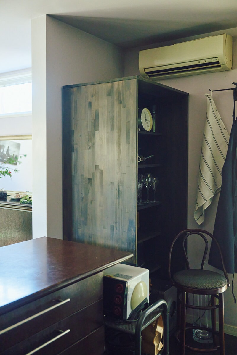 キッチン奥の自作キャビネットは、棚板の奥行きに対して側板の幅を広く取っているため、中身が見えず目隠し効果抜群。