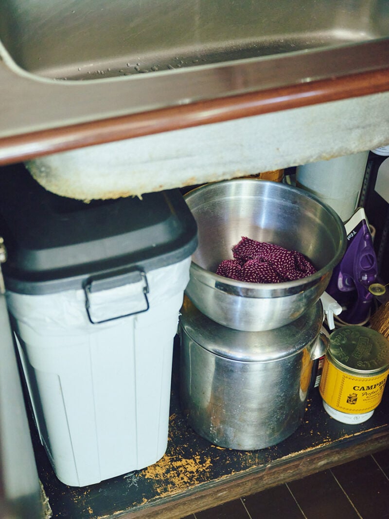 ゴミ箱や使用済みのふきんなど、表に出したくないものはシンク下が定位置。