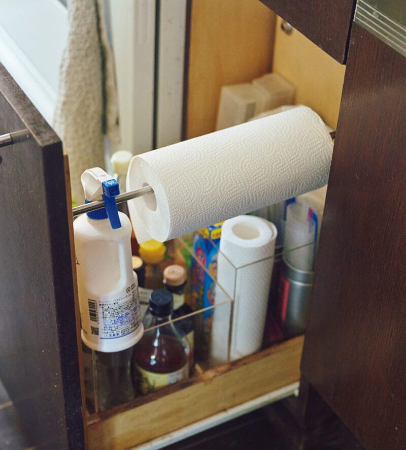 引き出しの内部にはつっぱり棒を渡し、キッチンペーパーを引き出しやすいように工夫。