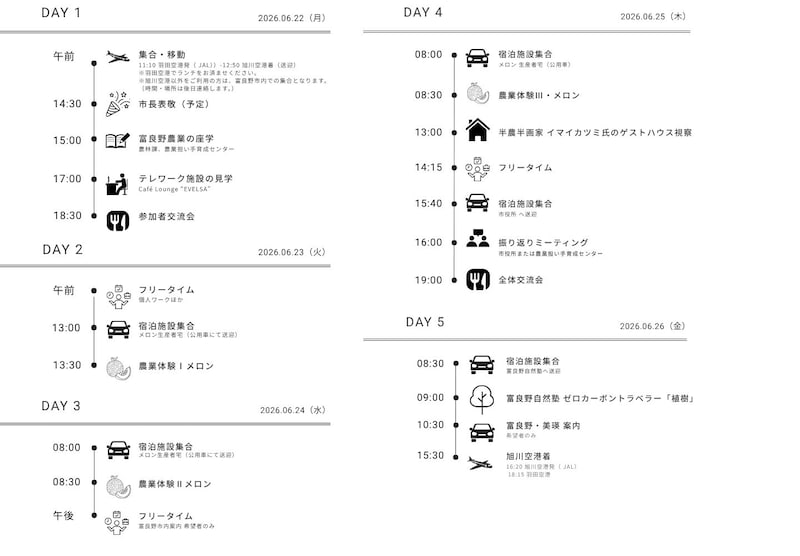 〇開催期間:令和8年6月22日(月)~6月26日(金)4泊5日 〇募集締切:令和8年4月26日(日) 〇対象 ・ 新規就農、 雇用就農 など「農」のある暮らし、働き方 を考えている方 *原則、 45歳未満 ・アグリビジネス、アグリテックに 取組む 企業社員等 ・食品 、飲料業界 に従事する 企業 社員等 〇参加費:無料(※現地までの交通費、宿泊、飲食等は自己負担) 〇定員:6名(最少催行人員3名) *参加者が確定後、オンライン説明会を開催。 〇移動:滞在中の移動は公用車でサポートあり(月・金は旭川空港送迎も可) 〇助成金:ワーケーション展開費用助成金の対象 *助成要件あり。希望者のみ。 〇宿泊先:宿泊施設をご紹介 。ご自身で宿泊施設を予約しても可。