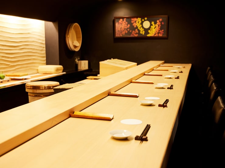 鮨が握られる様子を眺めながら、美酒佳肴に酔いしれるカウンター席