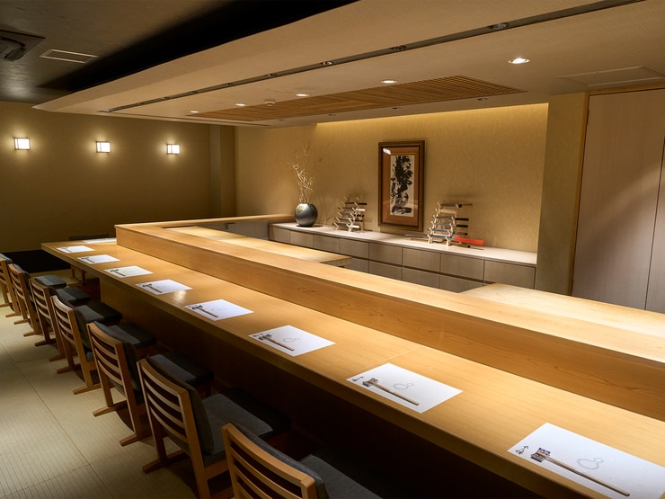 ブラウンとベージュのコントラストが美しい店内には、ゆったりと過ごせるカウンター10席のみ。凛とした空気の中、高級感に包まれながらも家庭的な温かさを感じさせてくれる居心地の良さも魅力です。目の前で繰り広げられる職人の匠技を眺めながら、静かに語り合うのも粋。記念日や接待などで、特別な時間を演出してくれる一軒です。