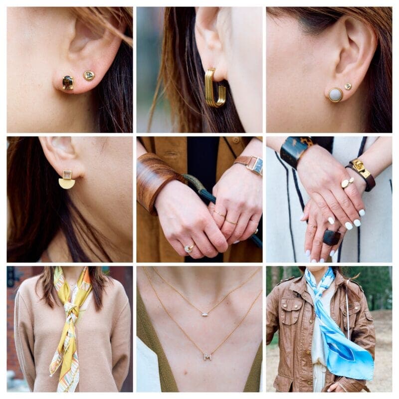 ヴィンテージアイテムのプロの栗谷さん。「シルクスカーフは1960年代、70年代のものが、クオリティが高い」と言います。ベージュ・ブラウン系のファッションの差し色にするのも、ヴィンテージスカーフ。また、耳元にはゴールドを中心に、ムーンクォーツやダイヤモンドなどのジュエリーをつけて、大人の品格をまといます。そのほか、ボリュームのあるバングルは、べっこうや木製など天然素材を選びます。ファッションがカジュアルなときは、ジュエリーやアクセサリー、小物でフェミニンに寄せる。そんなバランス感覚が栗谷さんのタイムレスなファッションのアクセントになっています。