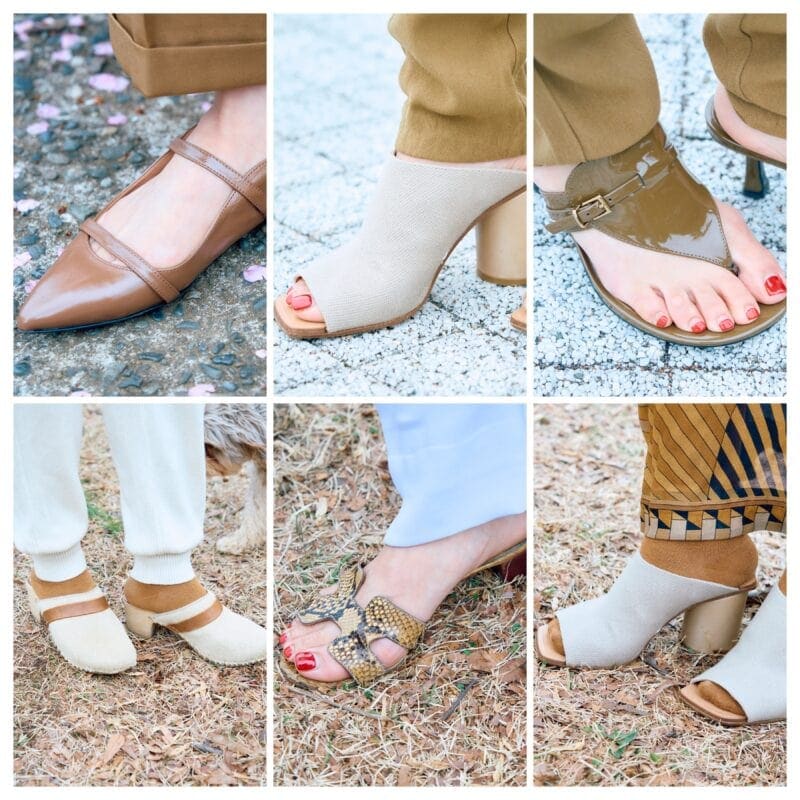 「Beau(ボー)ちゃんと一緒に出かけるときも、ハイヒールのほうがラクなんです」と栗谷さん。とはいえ、はき心地のいいデザインと安定したヒールのものを選びます。「マキシ丈のスカートやワンピースを着るときは、ハイヒールがルール」(栗谷さん)。足のネイルが映えるデザインのパイソンのサンダルは、カジュアルなコーデをフェミニンに見せます。