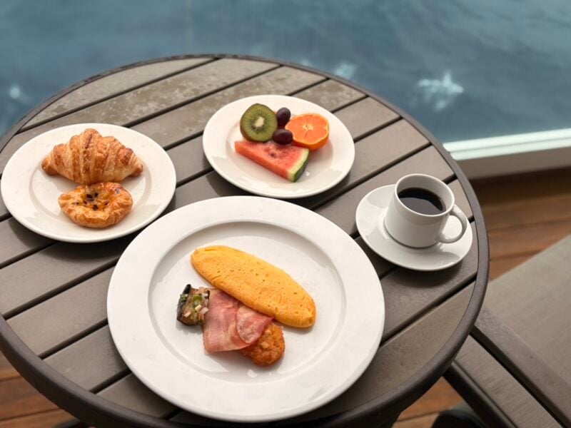 せっかくなのでバルコニーで朝食をいただくことに。海を眺めながら優雅なひとときを過ごしました。