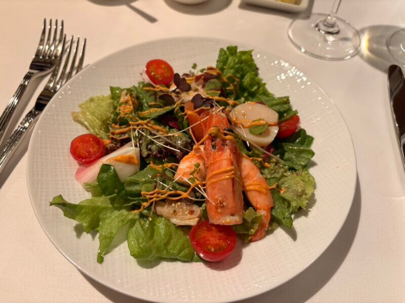 手間と時間をかけて仕込まれたコンソメ・ドゥーブルに、アボカドオイルをきかせたスープ「季節野菜の軽い煮込み、コンソメ仕立て」には、13種の野菜を使用。普段なかなか食べる機会がないペコロスやロマネスコなど、野菜がゴロゴロ入っていてほっとする一品です。天使のえびやほたて、いかをトッピングしたサラダも、とてもフレッシュ!