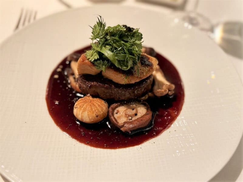 和牛はトロッとほどけるやわらかさで、濃厚なフォアグラとポルトソースのコクとベストマッチ。香り高いきのこも相まって、旨みが口いっぱいに広がる極上の一皿でした。