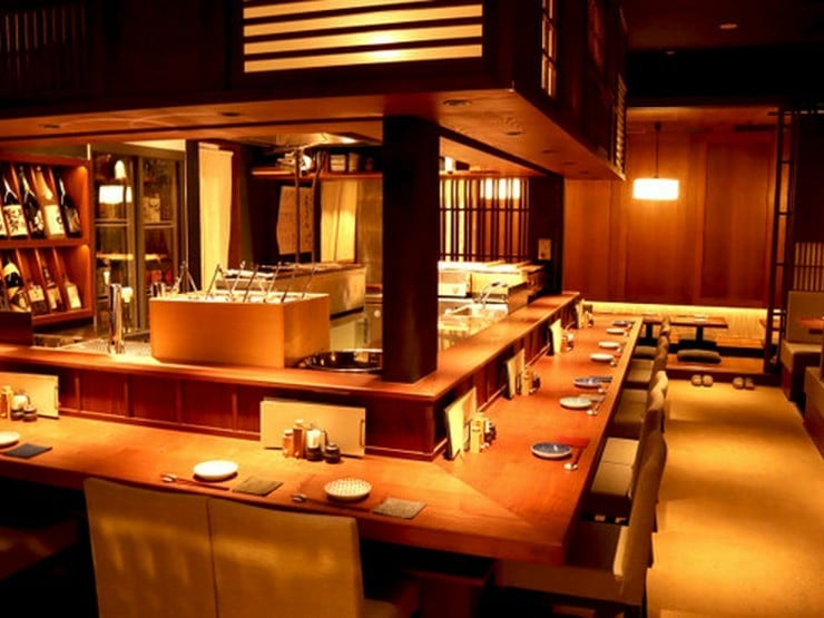 家紋入りの暖簾をくぐり一歩足を踏み入れると、そこはもう別世界。池を配した店内は、花や木々がちりばめられており、六本木交差点近くとは思えないほど静かな和の美食空間が広がっています。古木をふんだんに使った完全個室は接待に好評です。日本酒と焼酎は、時期により銘柄を入れ替えるこだわりようです。