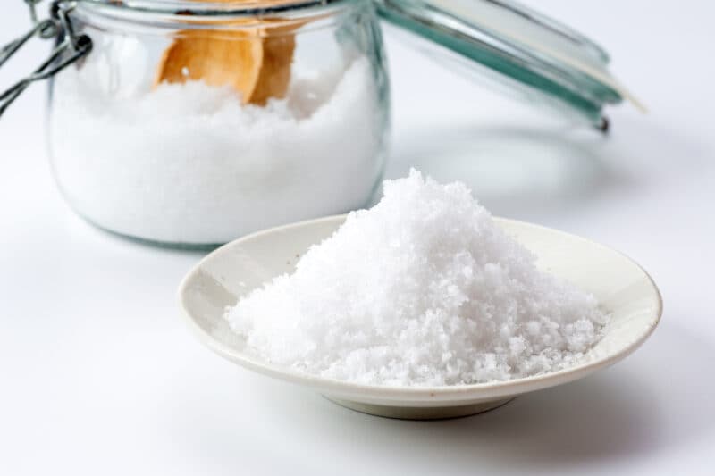 ①天然塩をお皿に平たく均一に乗せ、霧吹きなどで水を2~3回吹きつけたら、500〜600Wの電子レンジで1分30秒加熱。一度取り出してスプーンなどで全体をかき混ぜたら、再びレンジに入れて1分加熱します。
