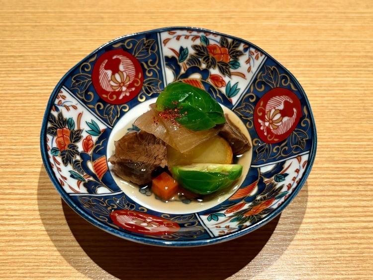 先附は、色鮮やかで上品な『黒毛和牛肉じゃが』から。おだしがしみ込んだ野菜と、ほろりとほどけるやわらかな和牛の旨みが広がります。続く凌ぎの『黒毛和牛の炙り寿司』は、雲丹と和牛の相性の良さを改めて確信させる、濃厚でとろけるような口どけに、思わず目を細めます。