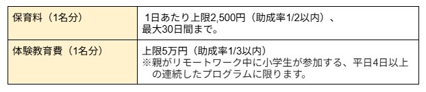 - 保育料(1名分): 1日あたり上限2,500円(助成率1/2以内)、最大30日間まで。