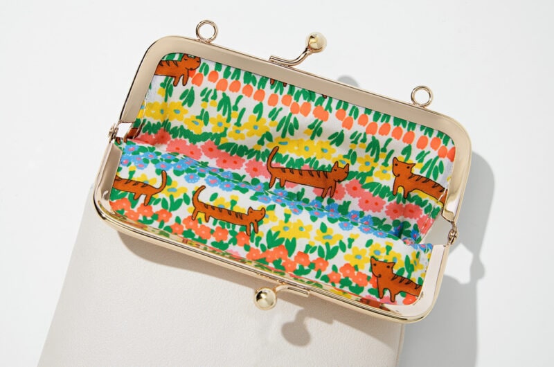 ポシェットの中は、ブランドオリジナルのネコと花畑がデザインされた華やかなテキスタイル。