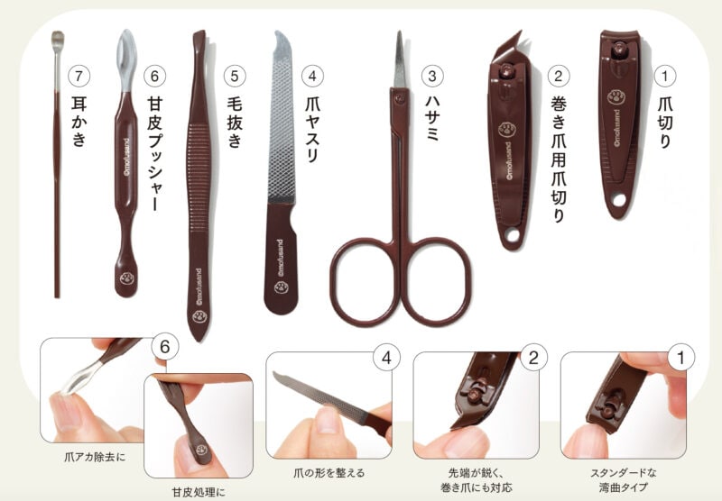 手元はもちろん足の爪にも使えます。ケアアイテムは、チョコレートカラーに塗装。
