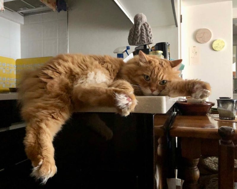 足をぶらんぶらんさせるのが好きなんだ。ほら、肉球もモフモフだよ!