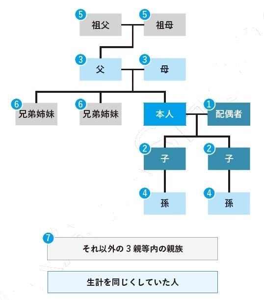 生計を同じくしていた人が複数いるときは、次の順番で一番優先順位の高い人1人がもらえます。同じ順番の人が複数人いるときは、代表者がもらって分け合います。
