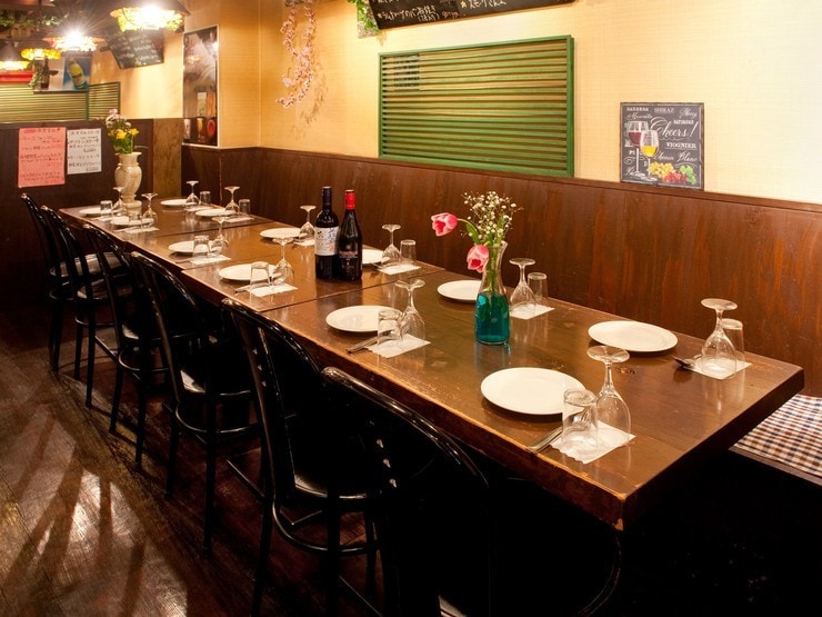 テーブル席とソファー席が用意された店内。飲み放題プランでは赤・白・スパークリング、ロゼとそろった世界のワイン70種類をはじめ、樽生、ハイボール、サワーなど多彩ドリンクメニューが楽しめます。日常の食事はもちろん、宴会や結婚式の二次会など各種パーティーでの利用も可能。ケーキやBGMなどサプライズ演出の相談もできます。