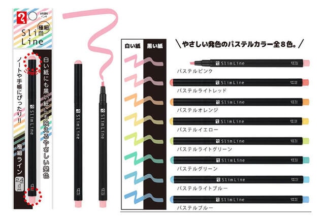 新製品は、スリムな2.4mm幅ペン先で、小さい文字、細い罫線にも、細くきれいな線が引ける。裏移りの少ない水性顔料インキを採用。白い紙にはもちろん、黒い紙には「ふわっ」と浮かびあがるように発色する。