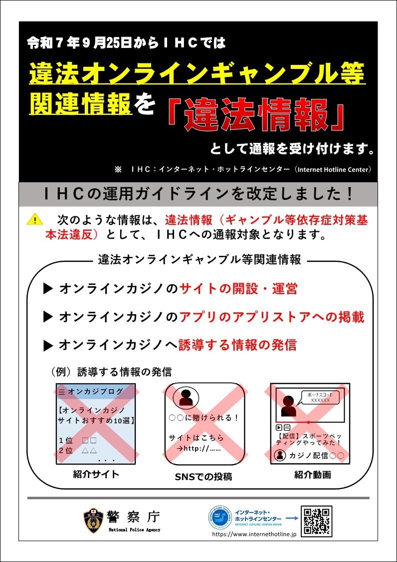 そして警察庁もインターネット・ホットラインセンター(IHC)の運用ガイドラインを改定。上記のような行為に関する情報を「違法情報」として、通報の受け付けを開始している。