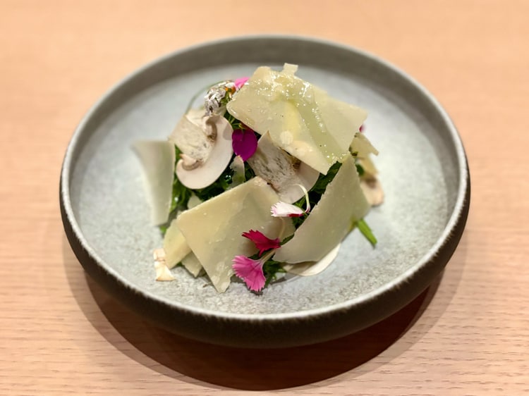 ひらまつの全国ネットワークを活かし、農家から直送される野菜(この日は福岡産)を使ったサラダ。瑞々しい苦味と甘みが弾けるマイクロリーフに、パルメザンチーズの熟成した濃厚なコクと塩気が、野菜本来の輪郭を鮮やかに際立たせます。