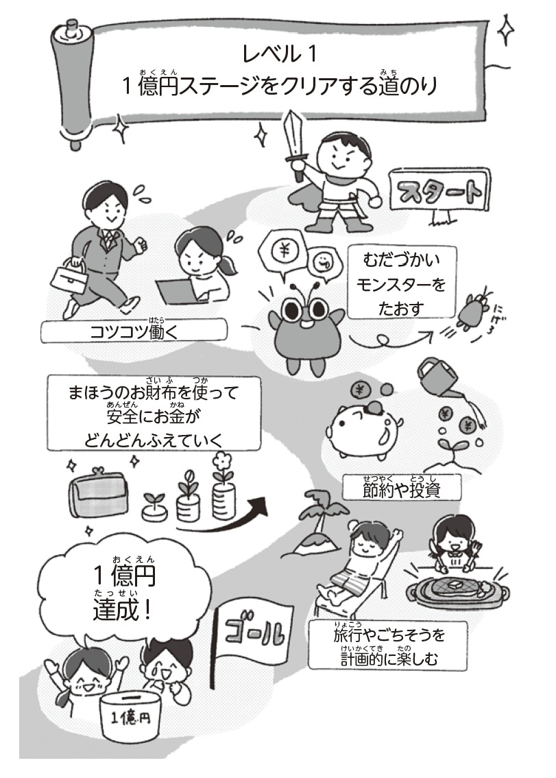 ぼくは、みんなにはレベル1「1億円ステージ」をクリアすることをおすすめします。1億円貯めるには、むずかしいじゅもんも才能もいりません。ぼくのようなふつうの人でもクリアできます。
