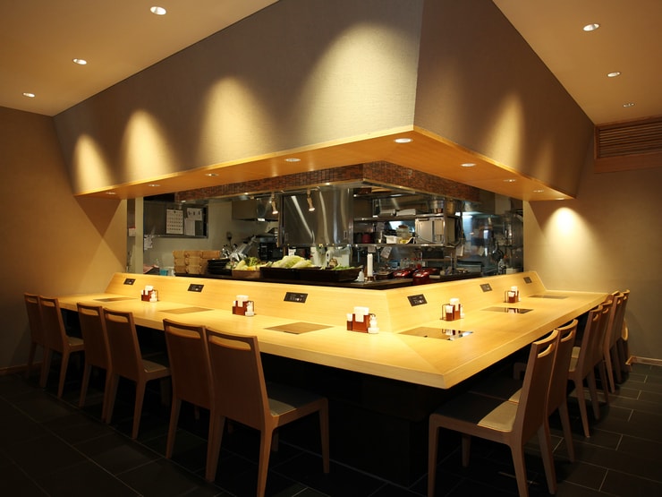 「紺」と書かれた大きな看板を目印にお店に入ると、中は和モダンで落ち着きのある空間が広がっています。ゆったり座れるカウンター席はオープンキッチンになっていて、調理の様子がライブ感たっぷりに眺められます。テーブル席の個室はデートにぴったり。家族連れにオススメの、掘りごたつ式の個室もあります。