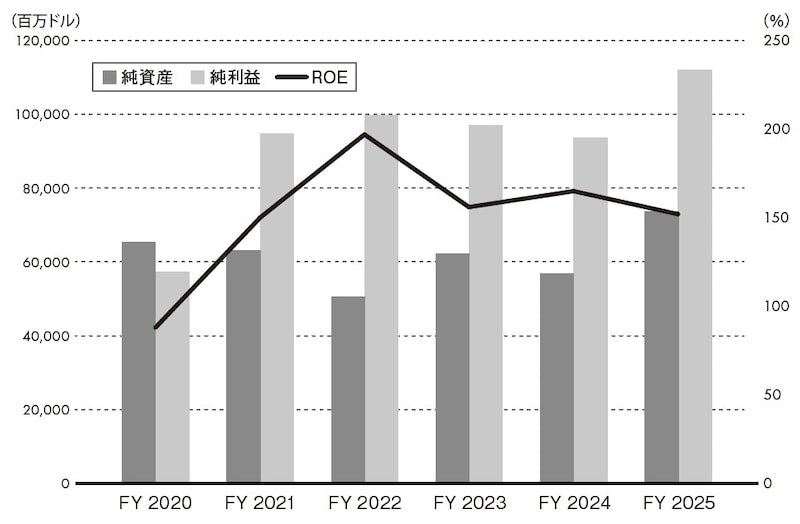 2025会計年度(Fiscal Year 2025) の純利益(Net Income)は約1,120億ドルと初めて1,000億ドルの大台を突破しましたが、2020年度以降はほぼ1,000億ドルに迫る利益をあげてきたことが[図表1・2]からもわかるでしょう。