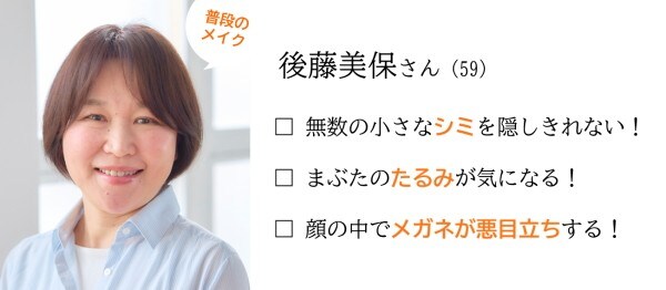 後藤さんのお悩みは、「シミ&たるみとメガネの悪目立ち」