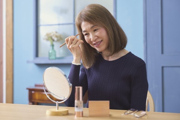 無数のシミも悩みでしたが、メガネとメイクの組み合わせにより視線が目元に集まるからか、シミへの意識が薄れ、気持ちが明るくなりました。