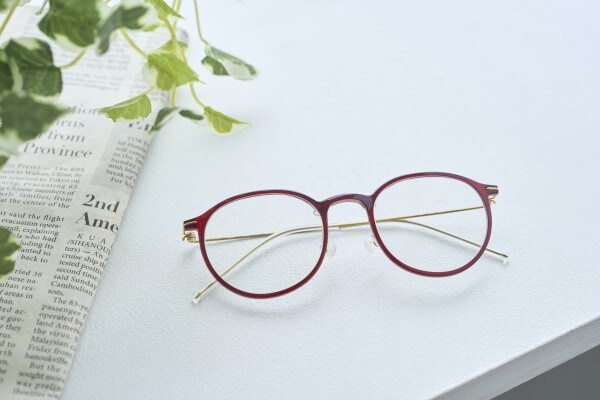 フレームが大きめで上部がゆるやかなカーブのメガネは、眉毛に合わせやすいのが特長。鮮やかなチェリー色は、ブルベさんにぴったり。