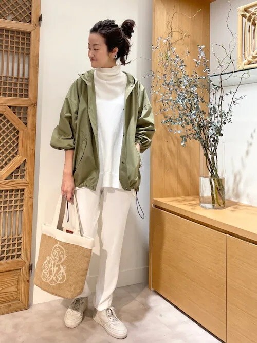 カジュアルなイメージが強いですが、最近のマウンテンパーカーは肩から袖にゆとりを持たせたドルマンスリーブや、写真のようにウエストがドローストリング仕様でコクーンシルエットのように形を変えられたり、とおしゃれ度が高いものが充実しているので、スポーティーすぎずに着られるところも大人向け。