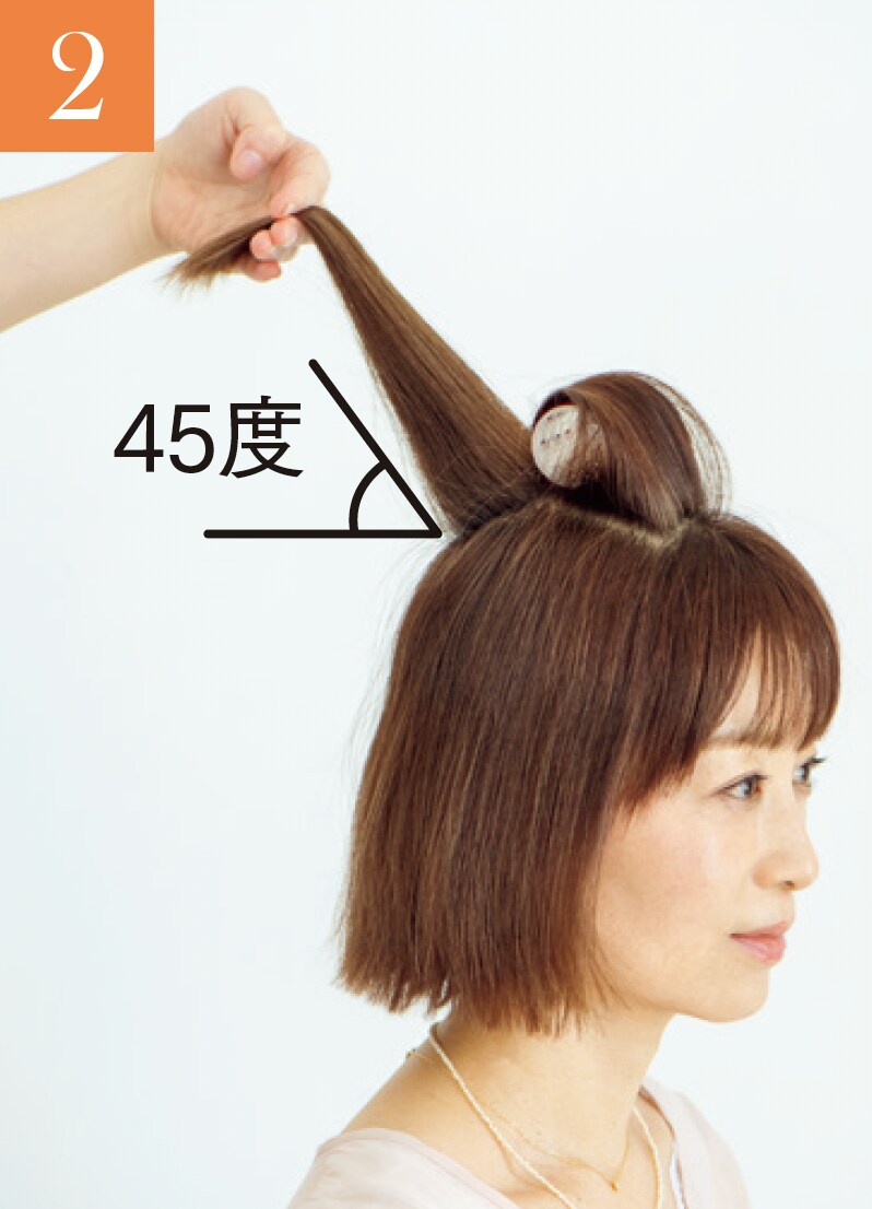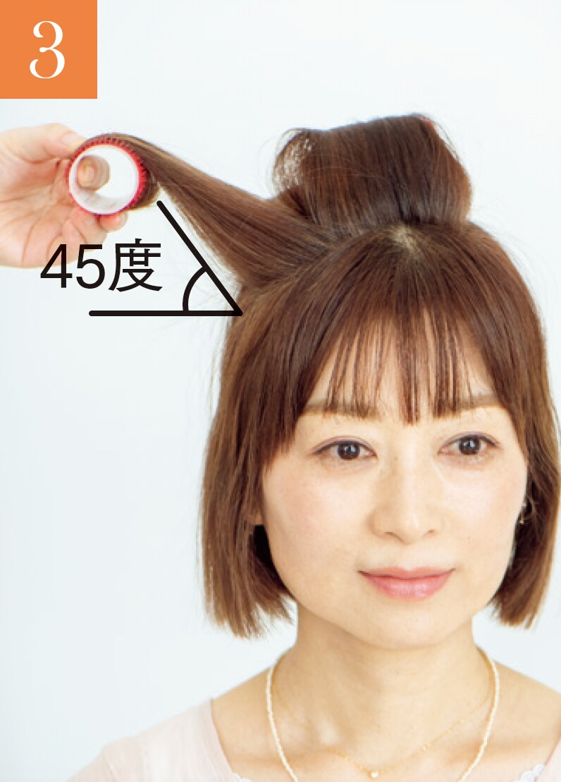 髪を斜め45度上に引っ張ってから1と同様に巻く。