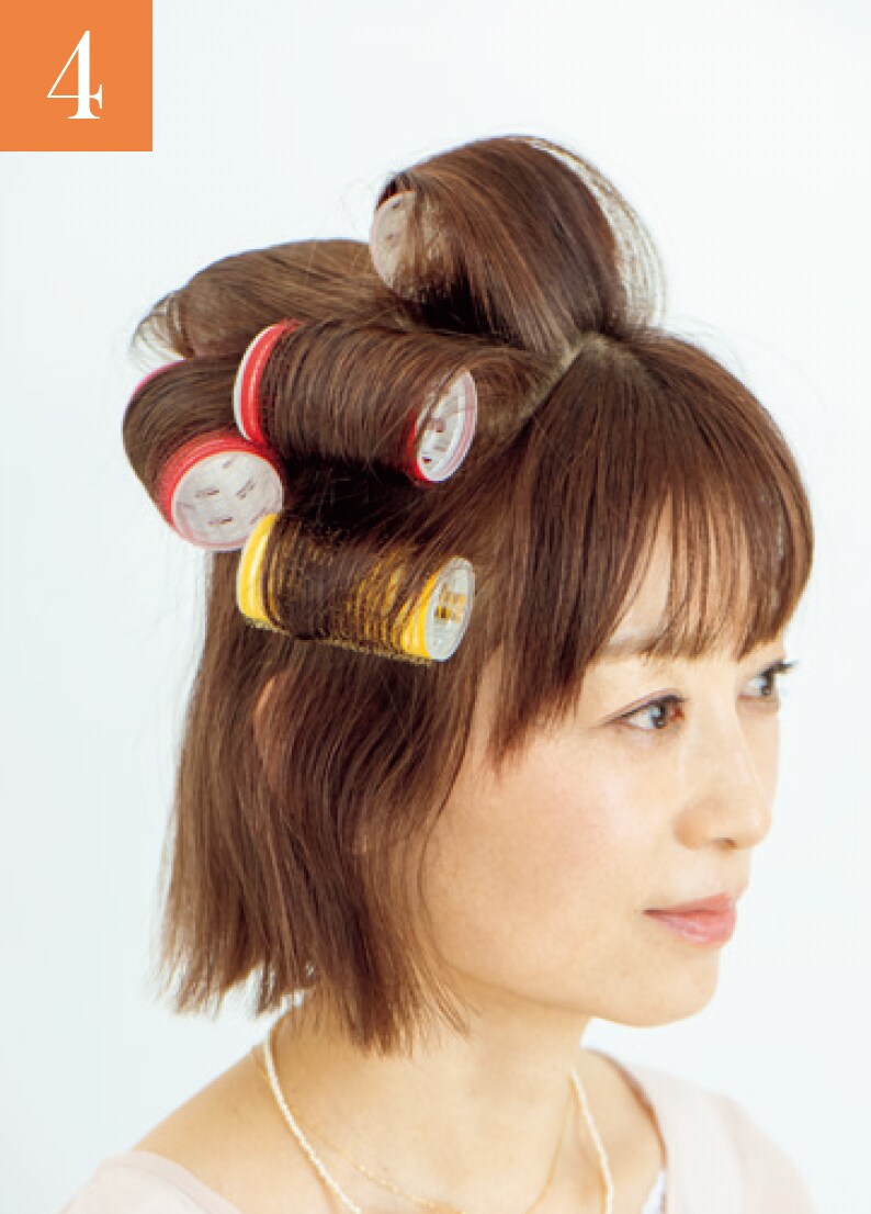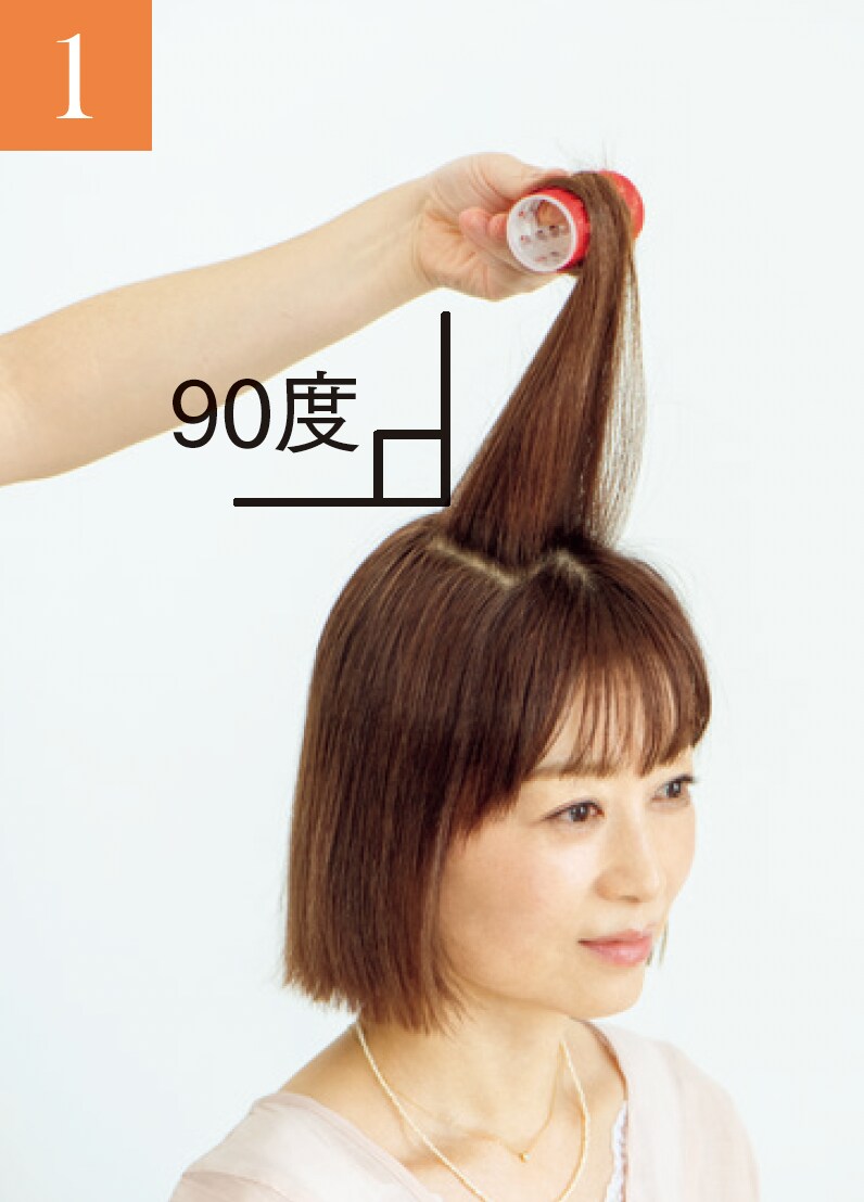 トップの髪を真上に持ち上げ、毛先寄りからスタートして根元まで強めに巻く(ロングの場合は、髪の中間あたりにカーラーをあて、毛先を巻き付けてから、根元に巻いていく)。