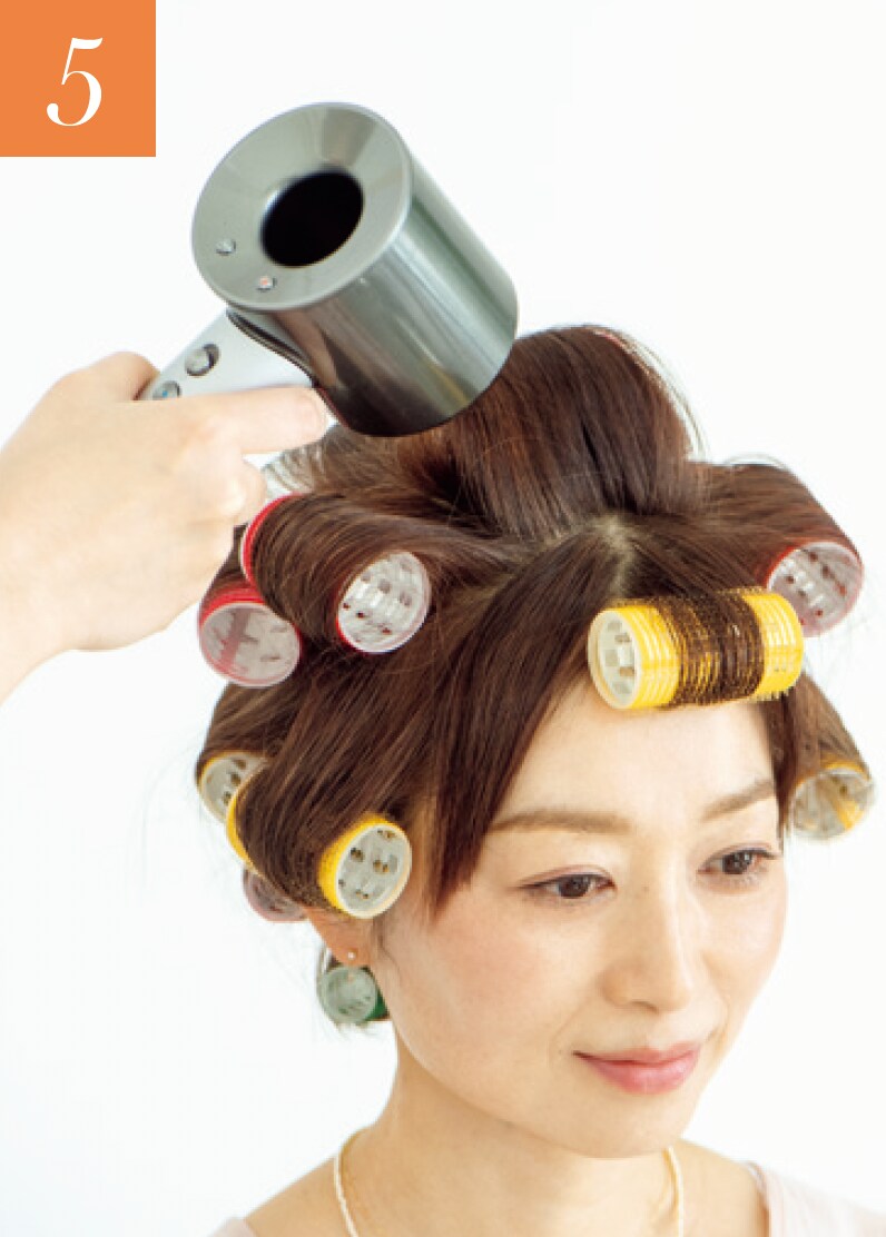 マジック・カーラーとは、表面がマジック・テープになっていてピン不要で髪を固定できるカーラーのこと。巻く前にセット用のローションを髪全体に吹き付けて、軽くドライヤーで乾かしてからスタート。