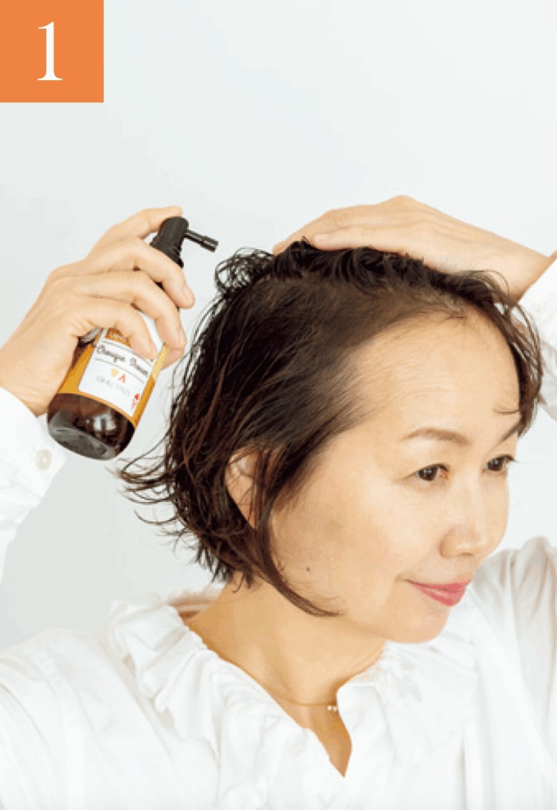 カールセット用のスタイリング剤を根元からまんべんなくスプレー。